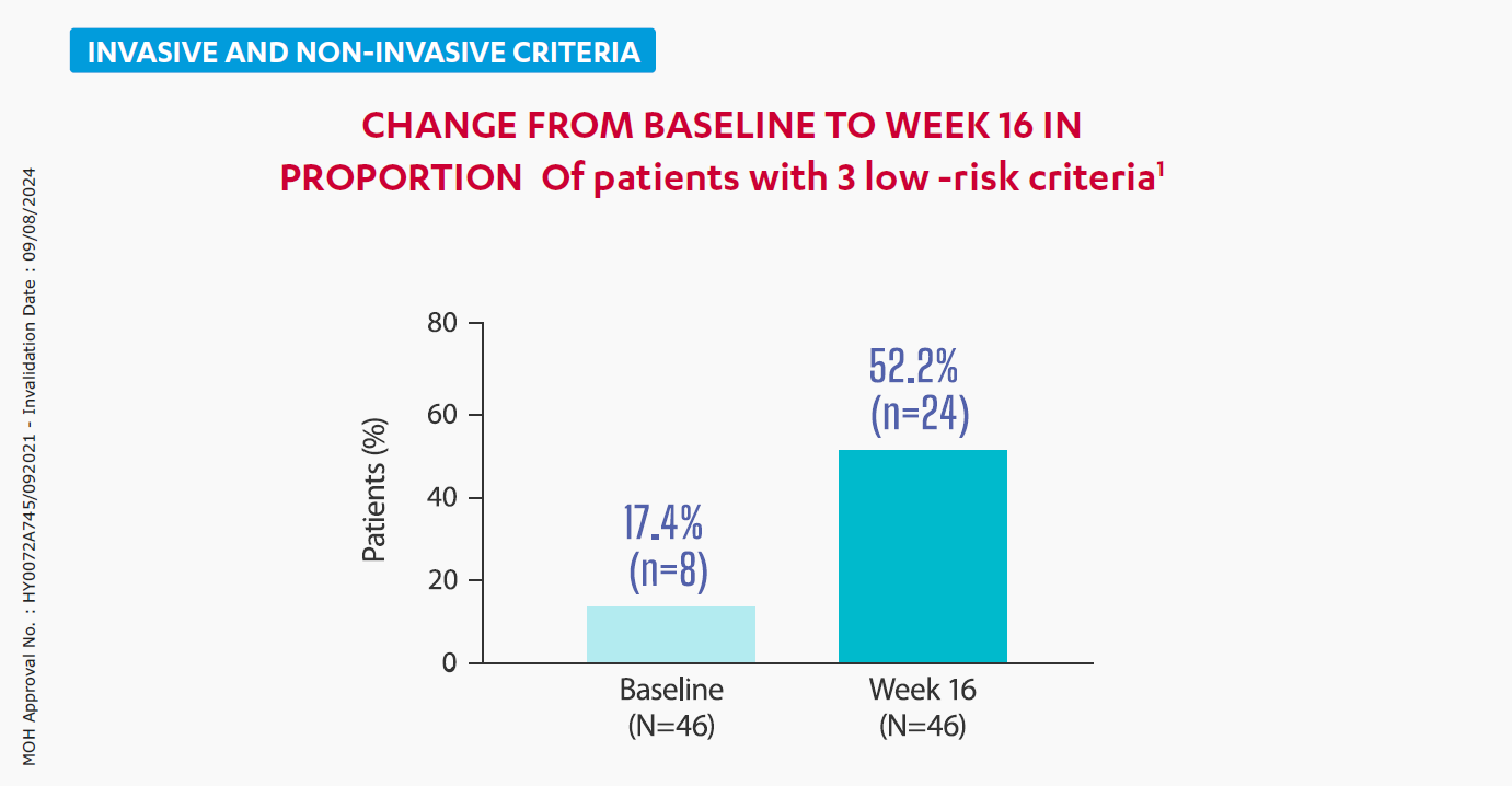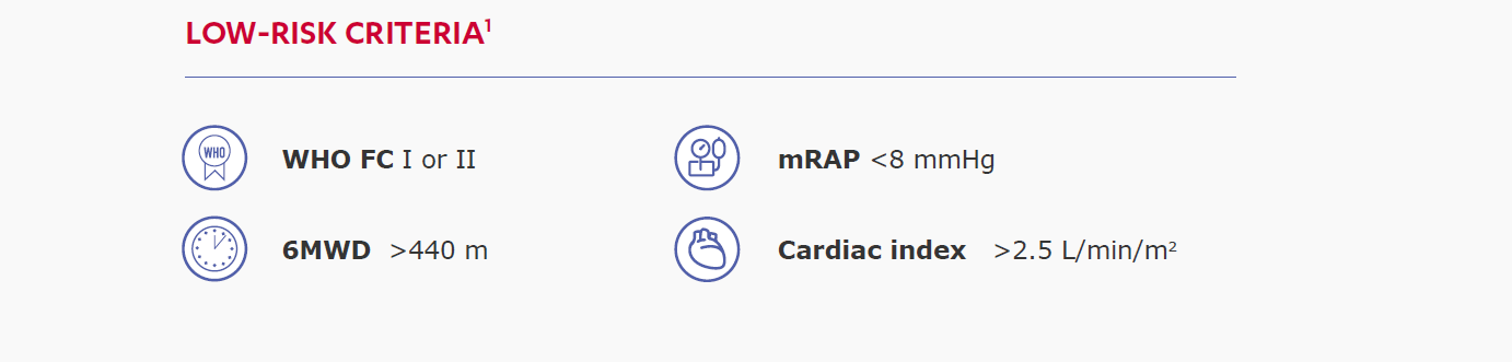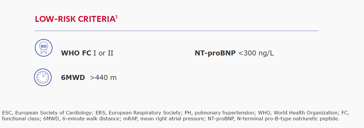 Two sets of parameters were assessed and the thresholds used to define low-risk were updated post hoc to align with those recommended in the (ESC)/(ERS) guidelines. Low-risk criteria: invasive and non-invasive variables defined as FC I/II, 6MWD >440 m, mRAP <8 mmHg, and cardiac index >2.5 L·min−1·m−2, Lowrisk criteria: non-invasive variables defined as FC I/II, 6MWD >440 m, and NT-proBNP <300 ng·L−1.1