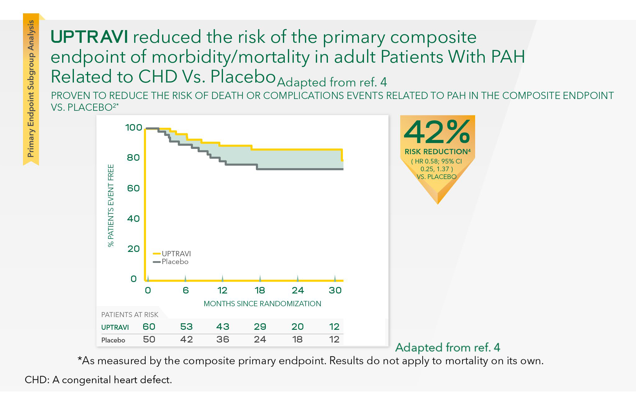 4. Beghetti M, Channick RN, Chin km, et al. Selexipag treatment for pulmonary arterialhypertension associated with congenital heart disease after defect correction: insights from the randomised controlled GRIPHON study. European Journal of Heart Failure. 2019; 21: 352–359.